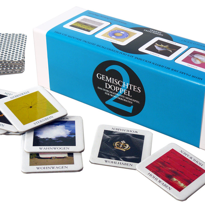 MIXED DOUBLE 2 - Plus de paires de mots torsadées du jeu de mémo culte créateur de langage comme Fastentee - Kartenfee, dans la deuxième édition dans une boîte blanche. Désormais, la recherche créative du langage pour d'autres appariements d'anagrammes qui ont du sens et qui sont amusants recommence. Cette édition favorise également la mémoire, les compétences linguistiques et l'art de l'association. "Un jeu délicat pour les penseurs latéraux, les acrobates de mots et les artistes de la mémoire." Brigitte Gifts